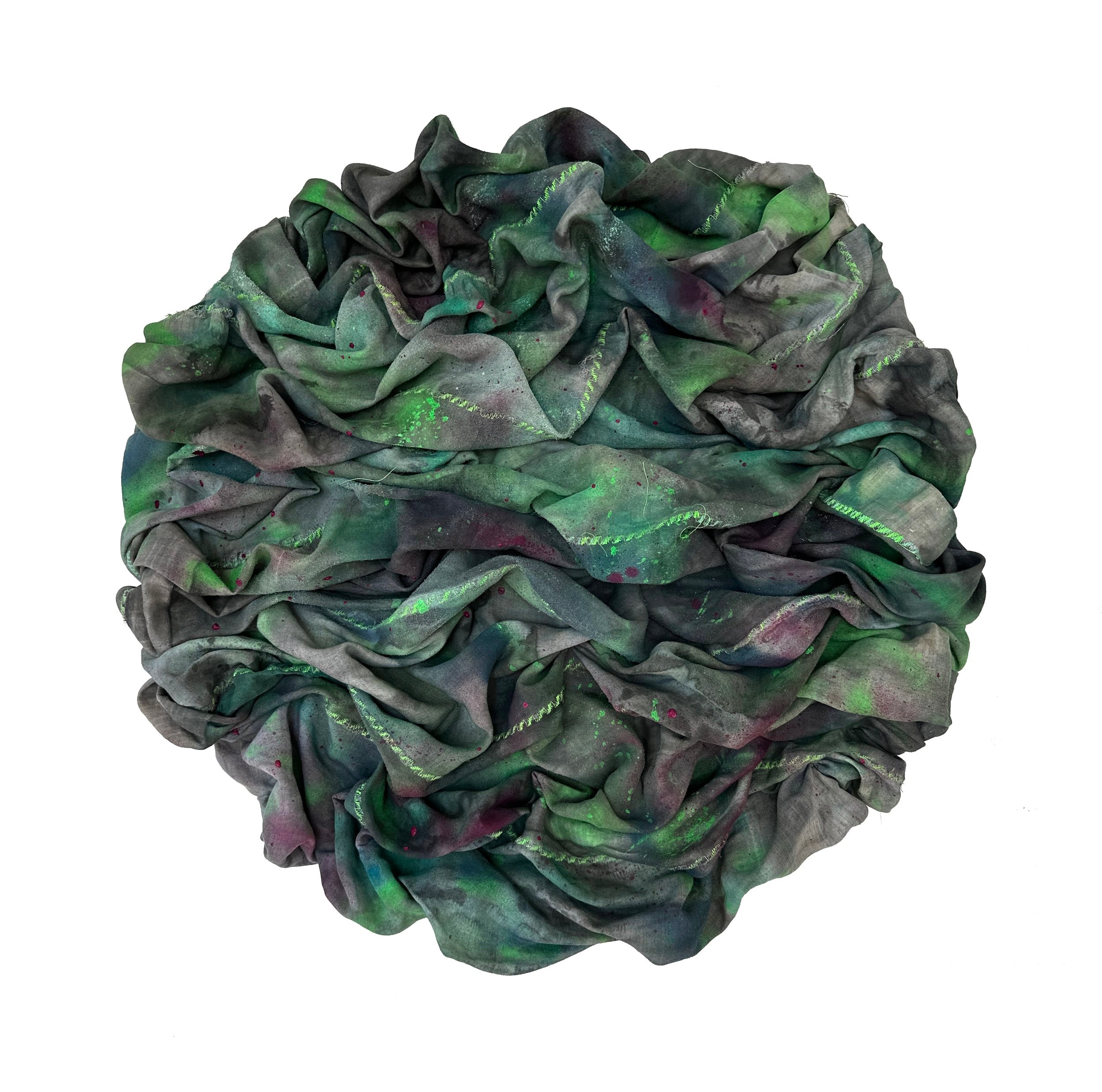 Repurposed fabric, Food waste, Recycled polyester, Acrylic UV-sensitive spray paint, UV-sensitive embroidery threads